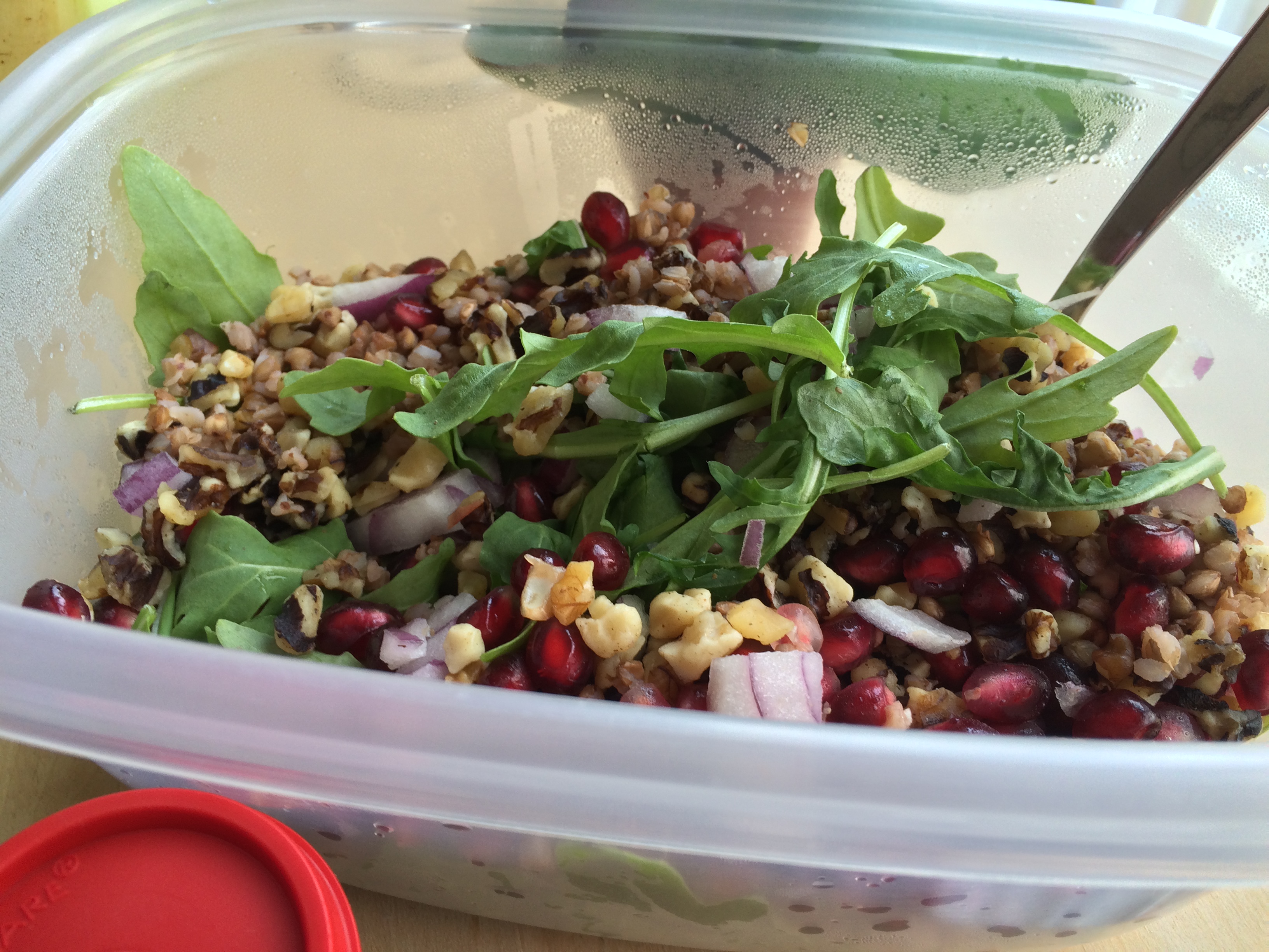 - Mélanger le sarrasin, les arilles de grenade, les fèves edamames, la roquette, les noix et l’oignon rouge.
