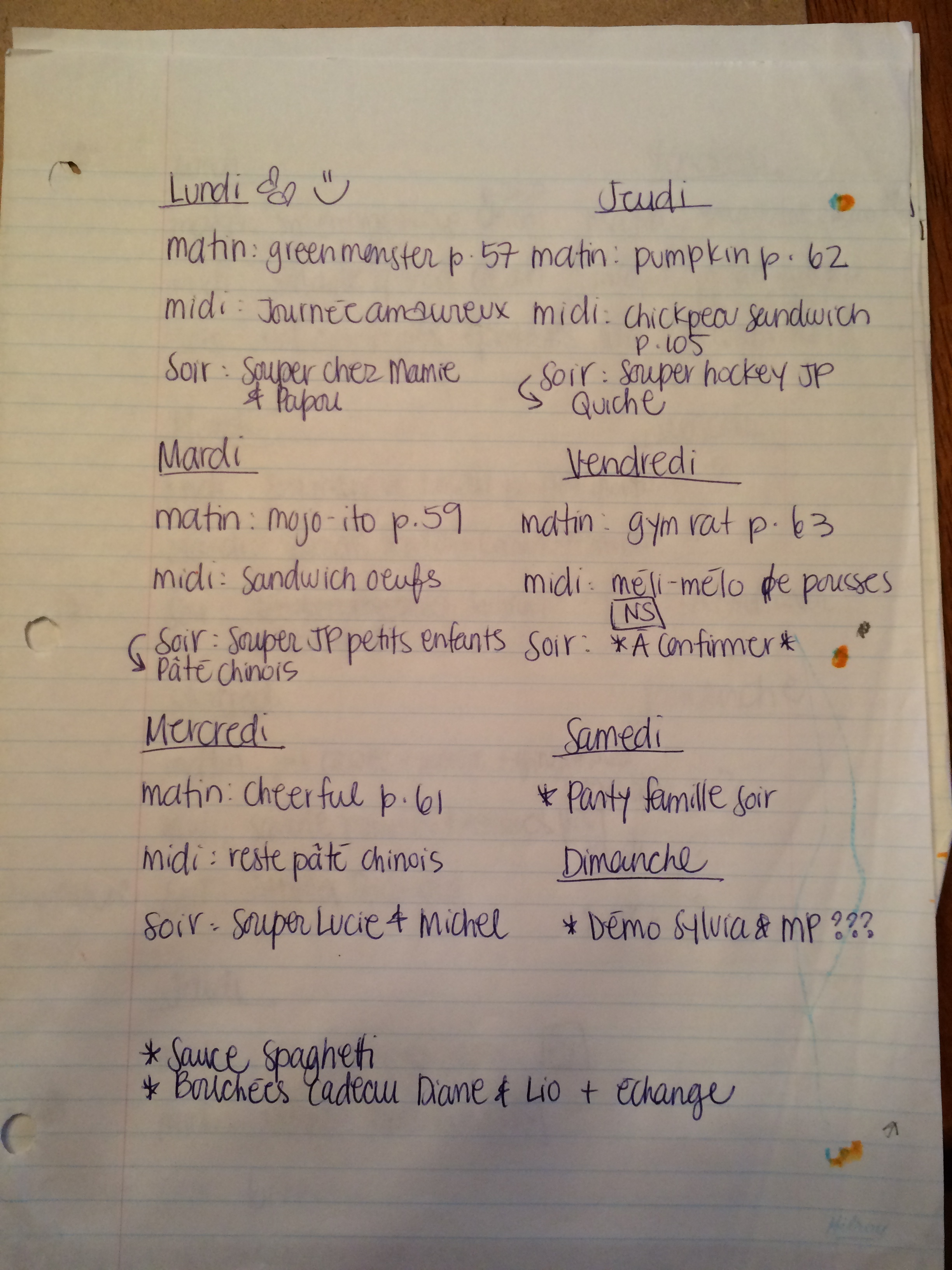 L’avantage d’écrire son menu et d’indiquer à quel endroit est la recette est que, si l’on doit s’absenter, notre conjoint(e) sait ce qui était prévu.