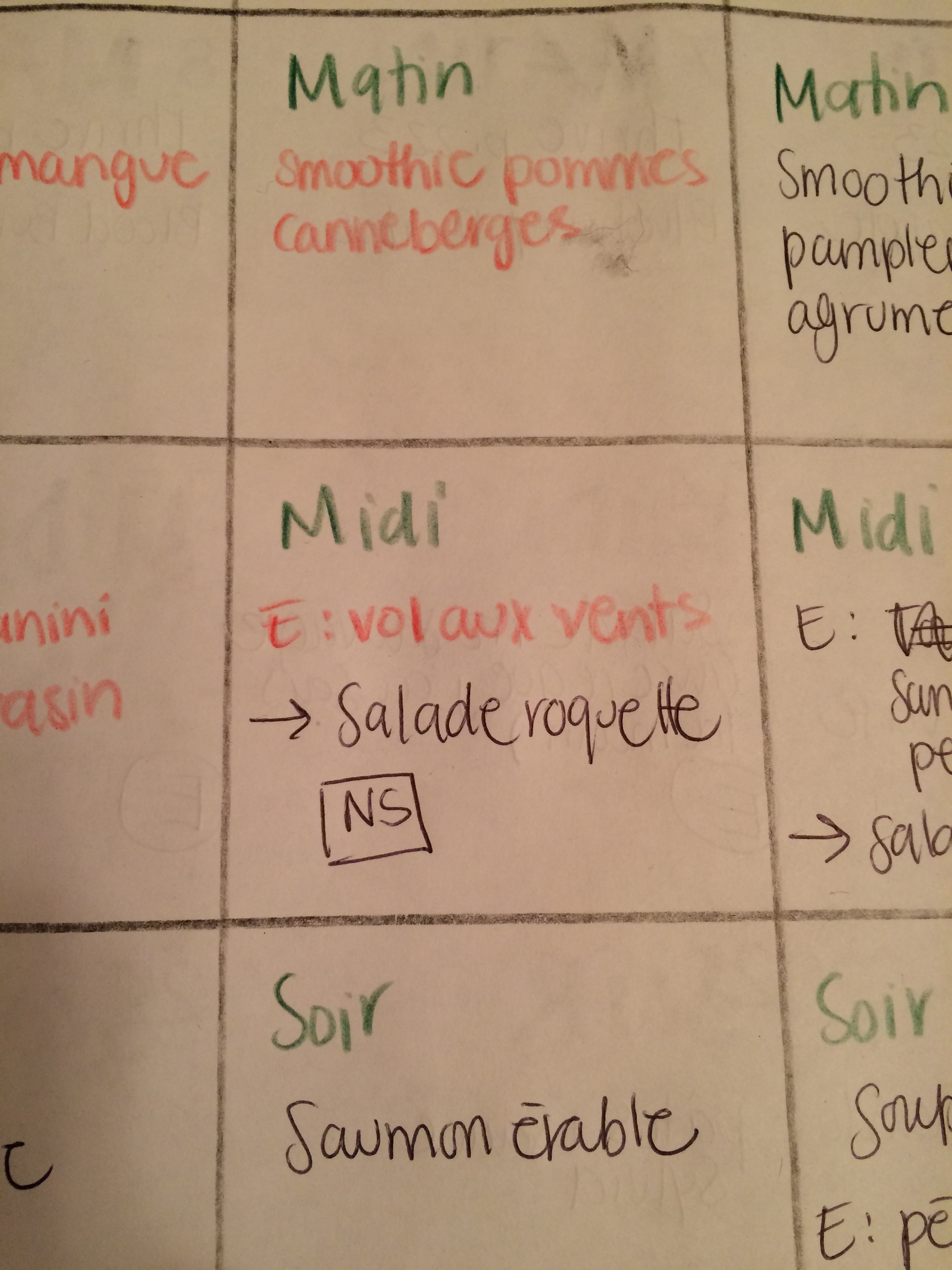 Après avoir décidé de la base (matin – midi – soir … du lundi au dimanche) et avoir indiqué les activités qui vont guider mes choix de repas, j’ajoute certaines notes à mon tableau :