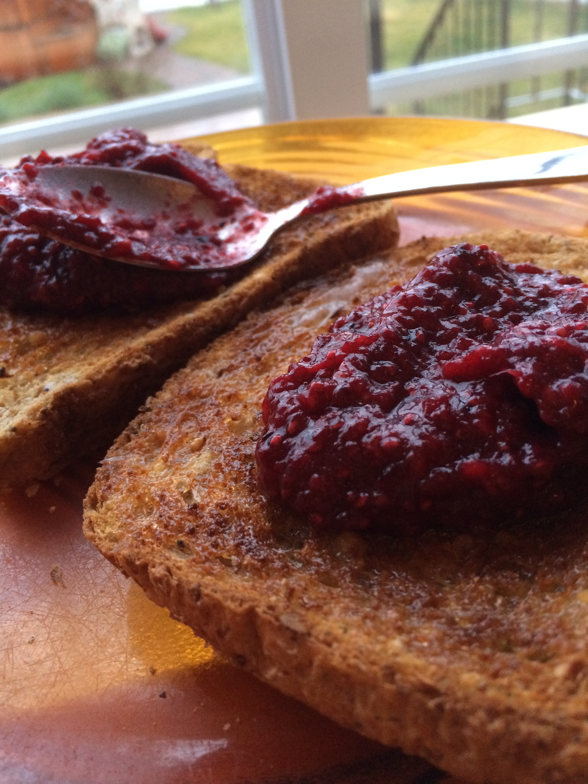 Dernièrement, j’ai essayé la recette de confiture au chia du livre Famille en santé de Chantal Lacroix, mais j’aime moins le fait que ça laisse un jus de fruit dans le fond du contenant (ou le fait que l’on doive ajouter beaucoup de chia pour que la texture sois plus épaisse).