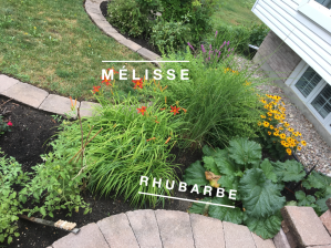 Viennent ensuite rhubarbe, mélisse, ciboulette et diverses tomates qui se partagent une autre section avec différentes fleurs sauvages.